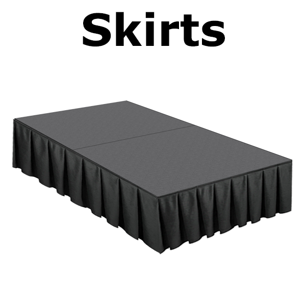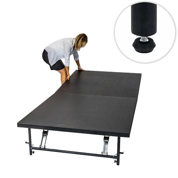 Modules come in 2.44mx1.24m sizes with a carpet or slip-resistant industrial finish. With built in wheels, separate storage and transport systems are not required and as the legs and connecting clamps are stored onboard there are no loose parts.